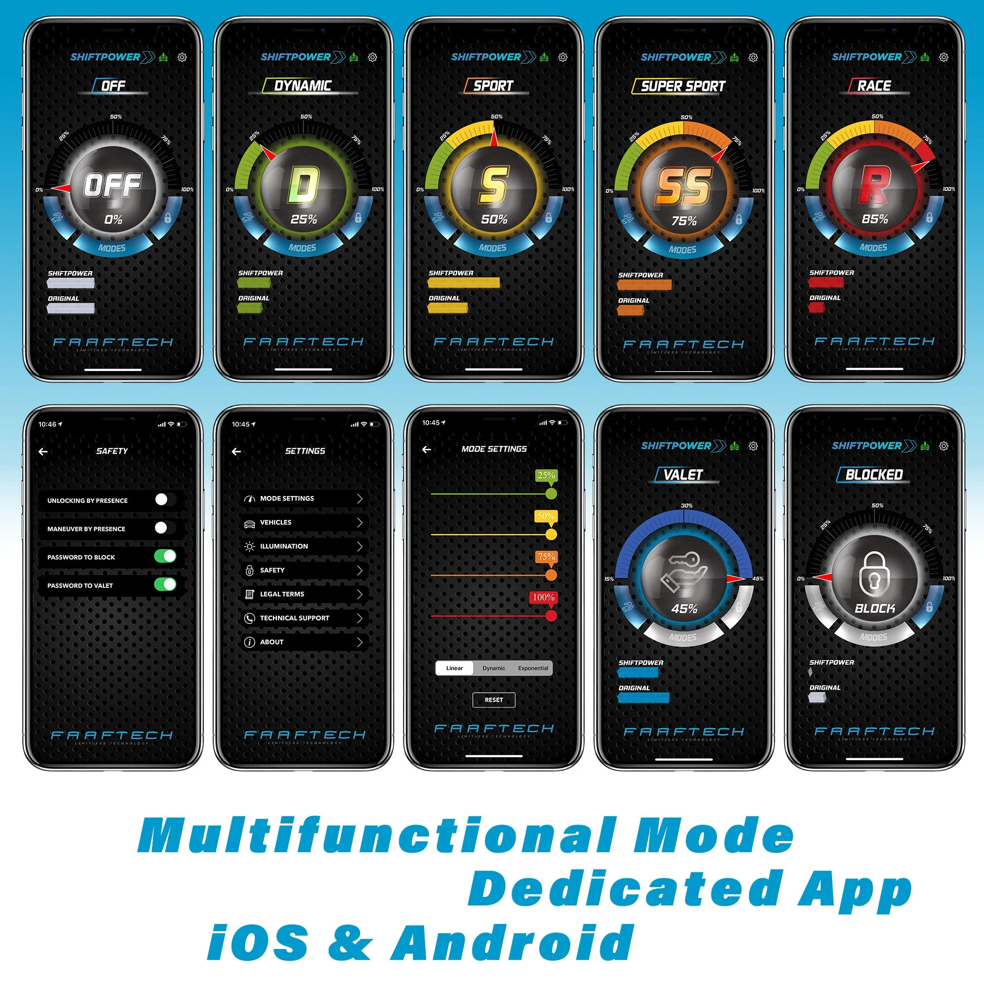 Eliminating the acceleration delay with various driving modes: Race, Super Sport, Sport, Dynamic, Eco, Valet, Lock with three different acceleration curves: Linear, Dynamic and Exponential.